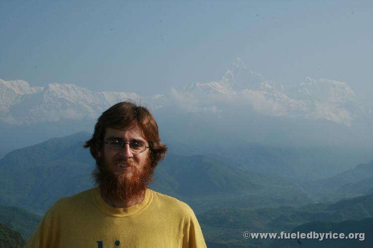 Nepal, Pokhara - Peter and the Anaupurna Himalayan range, with Fishtail mountain spiking up