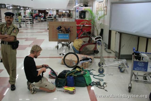 Indıa, Kolcatta aırport - reassemblıng bıcycles after our flıght from Bangkok to Kolcatta to get over Myanmar (closed borders wıth Indıa)