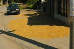 Drying the kernels of wheat.... on the street is very typical. Sometimes rocks are placed along the edges to head off the cars o